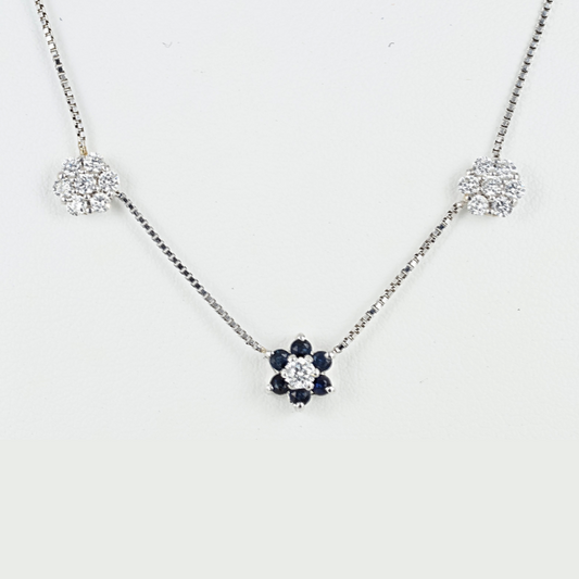 Necklace 3 flowers, 14KW Gold Diamonds Sapphires