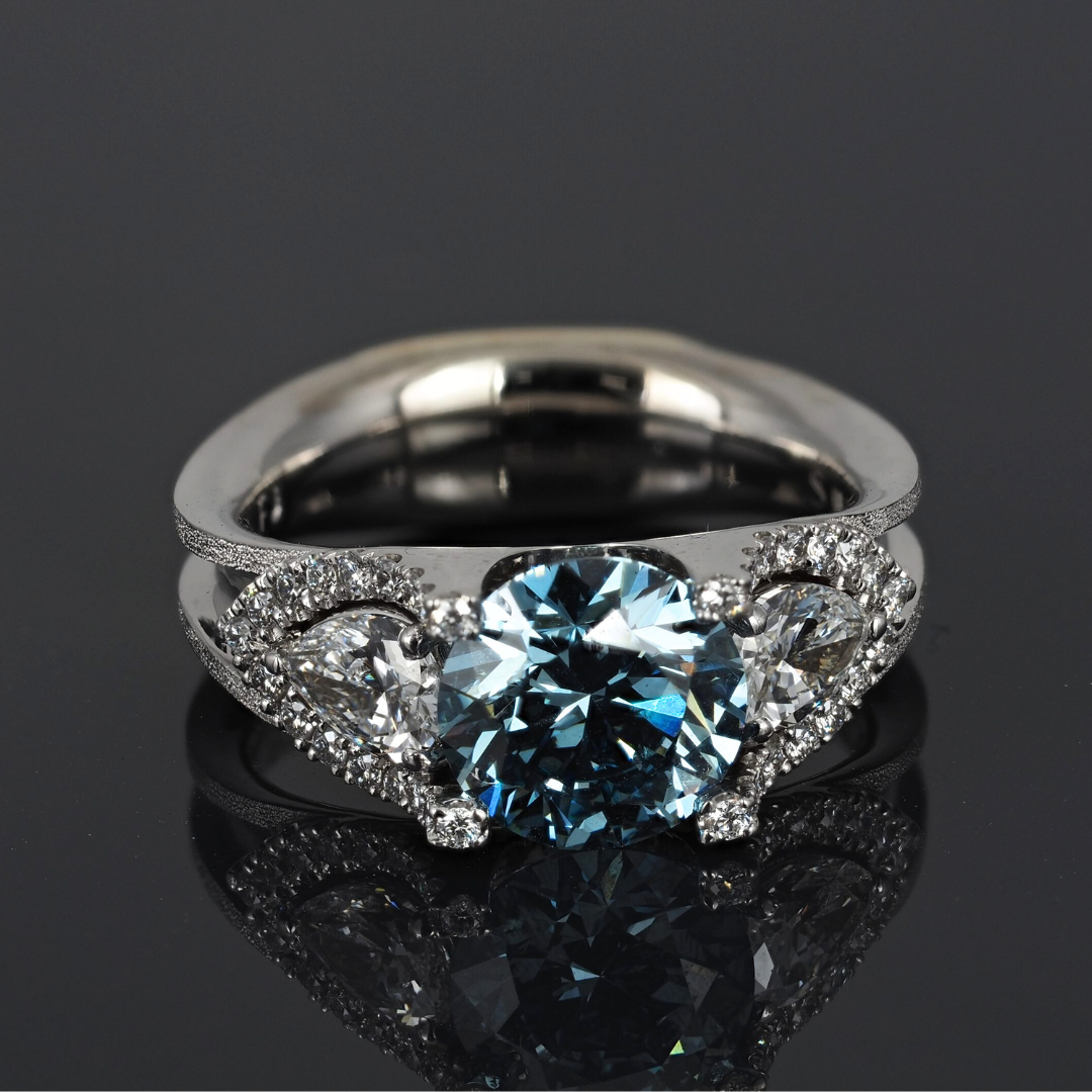 White Gold Ring with Blue Lab Grown Diamond Center Stone and Diamonds. This elegant ring is crafted in polished white gold and features a lab grown brilliant round-cut blue center stone. Flanked by pear-shaped white diamonds on each side, the design is further enhanced with a halo of pavé-set diamonds that add extra sparkle and sophistication. A perfect choice for engagements, anniversaries, or a timeless statement of love and elegance.