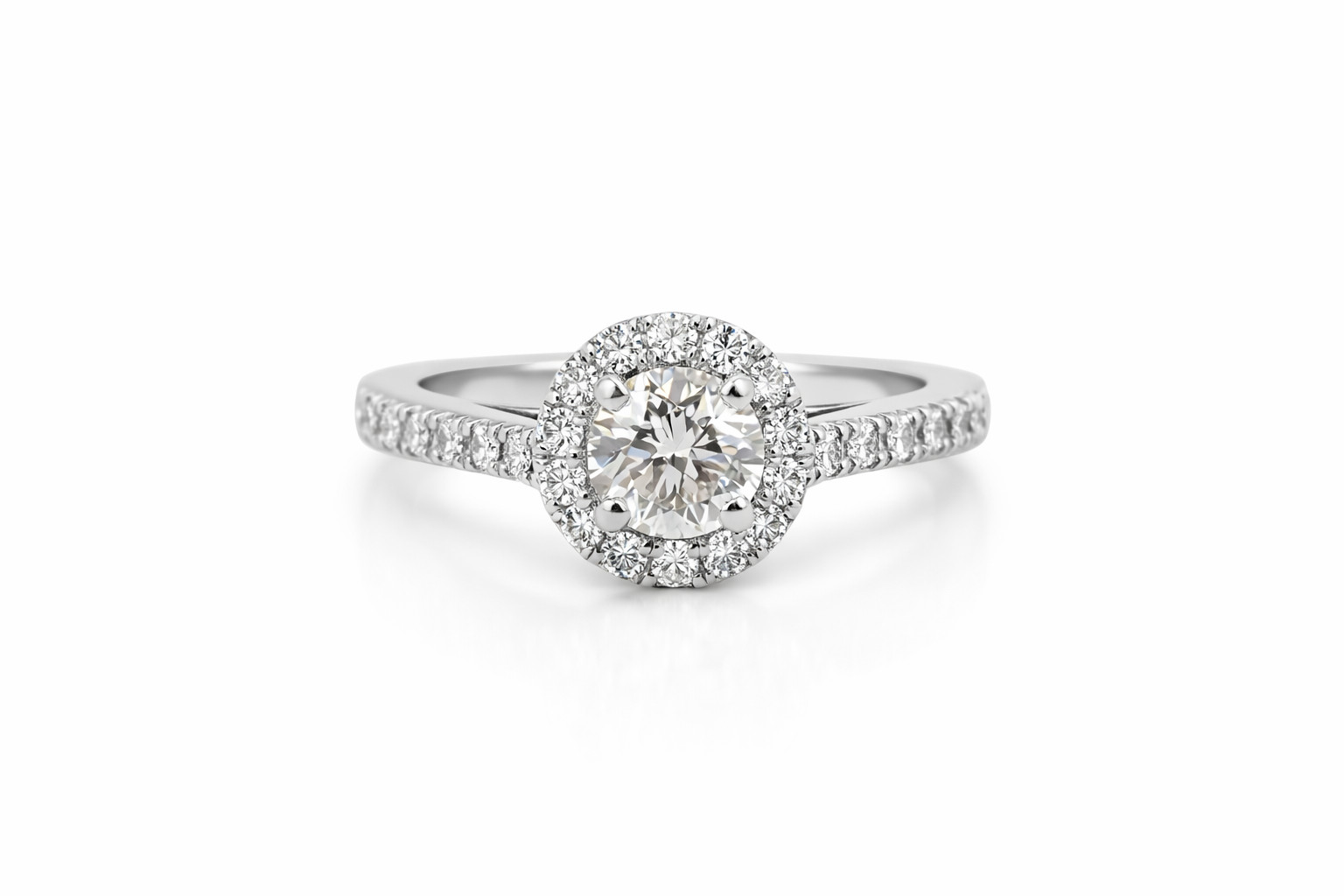 Celebrate timeless elegance with this 14K white gold engagement ring, crafted with 100% natural diamonds for exceptional brilliance and lasting value. A radiant natural center diamond is surrounded by a sparkling halo and diamond-accented band, creating a classic design that never goes out of style.